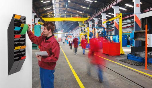 A többrekeszes prospektustartóban különböző dokumentumokat, pl. szállítmányozási igazolásokat, használati utasításokat vagy raktári leltárokat helyezhet ki, így mindenki könnyen és gyorsan hozzáférhet a szükséges információkhoz a munkafolyamatok során.