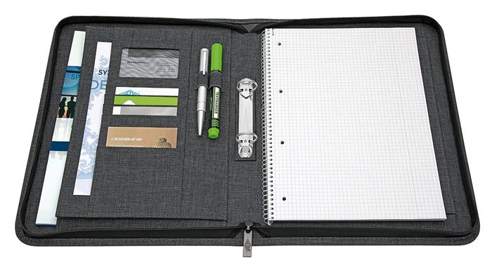sok zseb és rugalmas, gumírozott hurkok biztosítanak helyet kártyák, tollak és kiegészítők számára