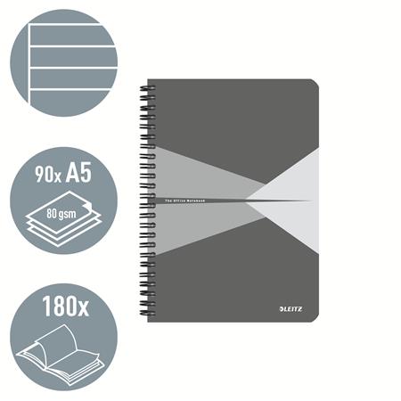 Spirálfüzet, A5, vonalas, 90 lap, laminált karton borító, LEITZ "Office", szürke