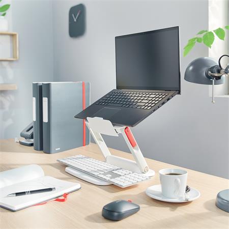 A Leitz Ergo notebook állvány a tökéletes ergonomikus magasságba emeli a laptop képernyőjét, így kényelmesebb betekintési szöget és testtartást biztosít.