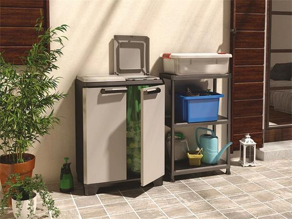 A KETER Split Premium szelektív hulladékgyűjtő szekrény intelligens kialakításának és modern, sötétszürke/fekete megjelenésének köszönhetően stílusosan és egyszerűen tesz a környezet védelméért.