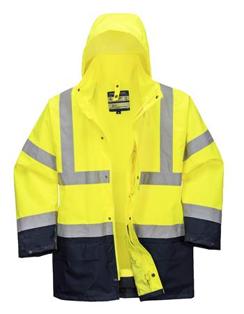Kiváló ár-érték arányt képviselő 5 az 1-ben jól láthatósági munkavédelmi kabát (kontraszt színekkel). A külső kabáton praktikus tárolózsebek, patentos, állítható mandzsetta és rejtett kapucni található. A ragasztott varratok vízállóságot biztosítanak. A belső kabát levehető, fluoreszkáló polár ujjakkal, két tárolózsebbel és sötét színű kontraszt panelekkel rendelkezik. A kétutas cipzár a gyors és könnyű hozzáférést segíti. A kabát öt különböző funkcióban, akár egész évben viselhető. EN 20471 szabvány szerinti 50 mosásra minősítve.